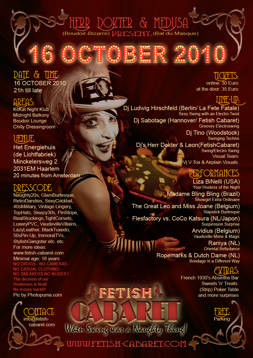 Kind Pause for Gratitude: We want to use this space to thank everybody who joined us for the Birth of Fetish Cabaret. A big hug, many kisses, and a huge thank you go out to all the performers, dj's, the decoration team, all the helping hands everywhere, the technical wizz who saved the night and lost 4 kilos doing it, the staff from the Lichtfabriek... ...and of course: all you people who chose to party with us, we miss you already, and we can't wait to see you all again, looking so wonderful, being so charming and complimentious, and enjoying our party...because that is why we do it. That is why we try to make our dreams reality. For you. THANK YOU. THANK YOU. THANK YOU. Medusa & Herr Dokter ***